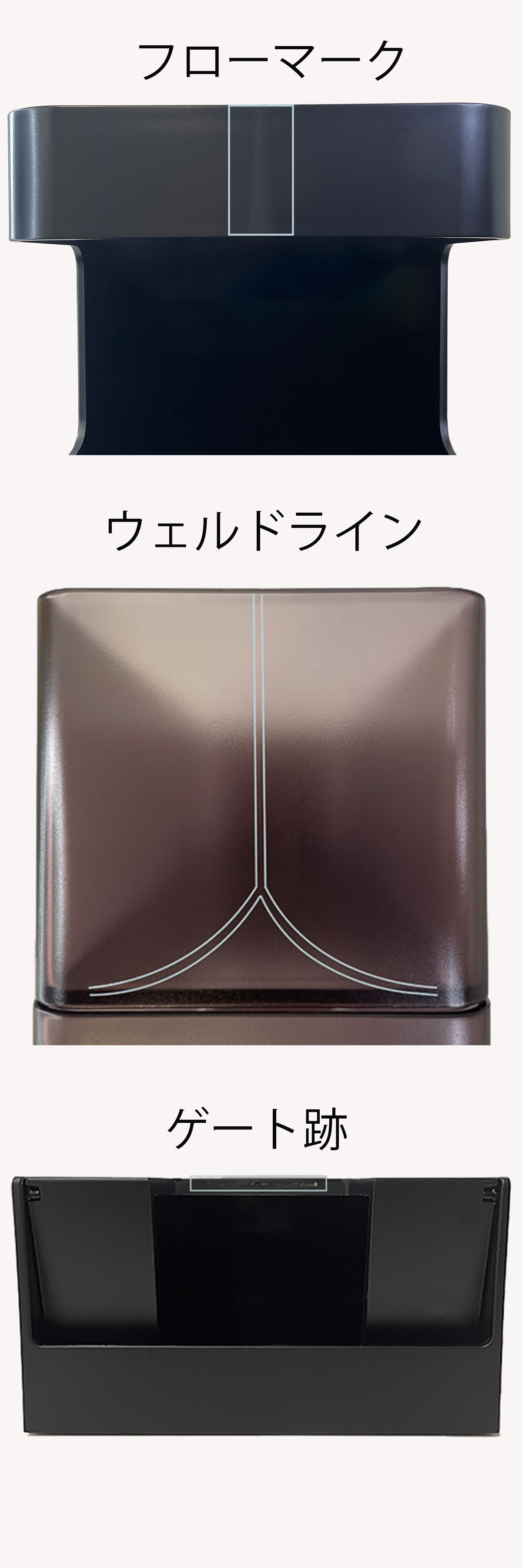 A.製造時、金型に流し込んだ樹脂同士が合流する部分に線状の跡が生じます。また、樹脂の成型後に切断した部分には、カットの跡が残ります。これらは「ウェルドライン」や「フローマーク」と呼ばれる製造過程上避けることができないもので、傷やひびとは異なり、問題なくお使いいただけますのでご安心ください。