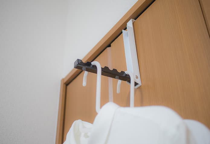 ドアやクローゼットなどの折れ戸に引っ掛けて使用。緩衝材付きでドアを傷つけない使わない時は折り畳んでコンパクトに付属品の木ネジを使用して壁にも取り付け可能フック部分に凹凸を付けているため、ハンガーがズレずに使いやすい購入はこちらからRakutenAmazon