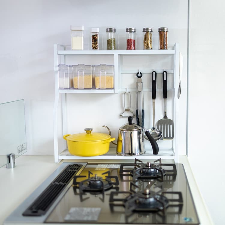 コンロ脇のスペースを有効活用。調味料などを一括収納できるスリムなラック中段棚は組み立て時に左右どちらにも設置が可能用途に合わせて着脱できるフック6個付き下段は約15cmもあるので鍋やオイルポットなども置けるMovie購入はこちらからRakutenAmazon
