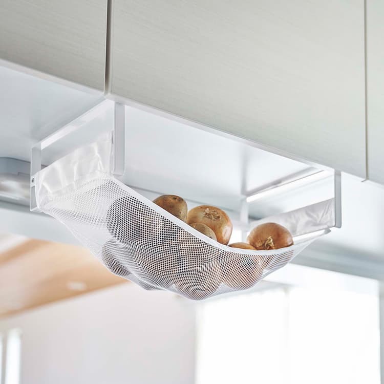 常温保存の野菜や果物を通気性の良いネットで戸棚下に収納パントリーなどの棚下の空いた空間を有効活用棚板に差し込むだけで簡単に設置できます風通しの良い状態で保存しておくと野菜や果物が長持ちしますメッシュ布は洗濯できるのでいつでも清潔に保てます購入はこちらからRakutenAmazon