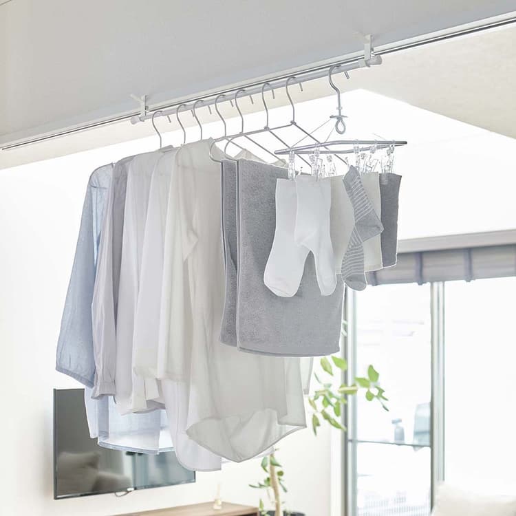 足りない物干しスペースの確保に便利。室内物干しフック2個組お手持ちの突っ張り棒やポールを掛ければ室内干しや収納用のハンガーバーになりますお部屋や浴室前の鴨居、窓枠の幅に合わせて簡単に取り付けられますフックとして帽子やバッグ、上着掛けとしても便利です上部に差し込むピン(針)と下部の調整ネジで固定し落下を防ぎます購入はこちらからRakutenAmazon