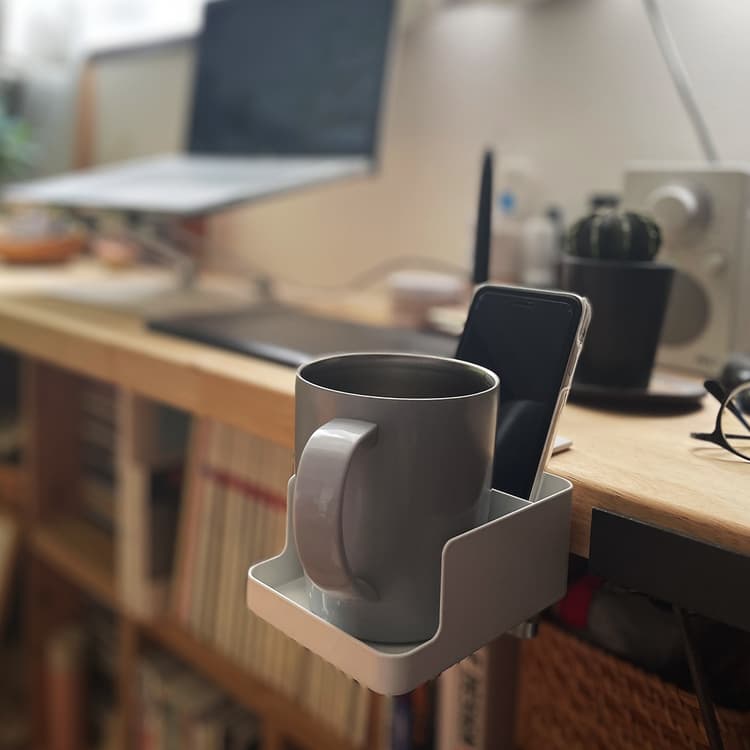 置き場所に困るマグカップやスマートフォン、リモコンの収納に便利なホルダーです。テーブル横やチェアの肘置きに簡単に取り付けが可能、デスクの上が片付き広々と使えます。スマートフォンは、底にケーブルを通す穴があるので収納しながら充電ができ、充電しない時にはケーブルの先端を引っ掛けて収納しておけます。ホルダー部分には縁があるのでコップの転倒防止になり安心。アウトドアテーブルやチェアに取り付けても便利です。取り付けは大きめの調節ネジ1つを締めるだけ、簡単にしっかりと取り付けられます。